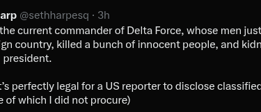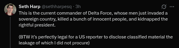 Adding to the chaos, journalist Seth Harp (@sethharpesq) attempted to dox the Delta Force commander, posting a photo and name claiming: “This is the current commander of Delta Force, whose men just invaded a sovereign country, killed a bunch of innocent people, and kidnapped the rightful president.”