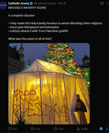 Brussels' controversial faceless nativity (designed for "inclusivity") saw its infant Jesus figure beheaded and head stolen overnight in late November.