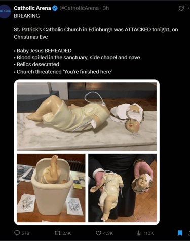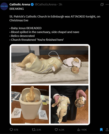 Similar incidents in Amiens (France), Trieste (Italy), and other cities involved decapitated baby Jesus statues, broken plexiglass, and destroyed figures.