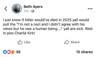 Exhibit A: A Facebook user comparing Kirk’s death to Hitler’s, celebrating it as justice rather than tragedy.