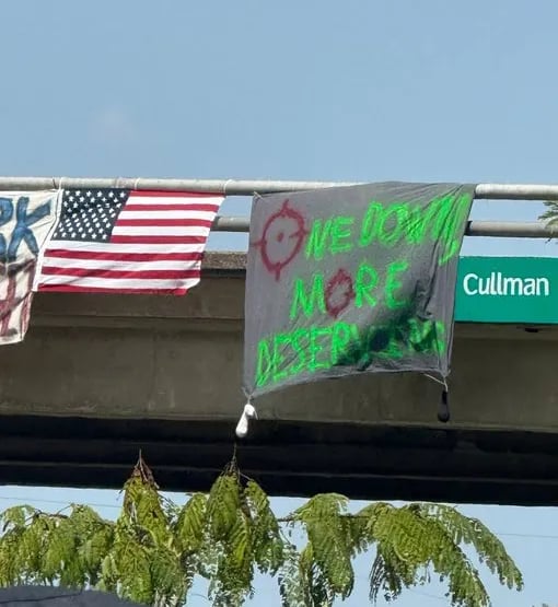 Exhibit D: Banner reading “One down, more deserving” — isolated posts transformed into collective declaration.